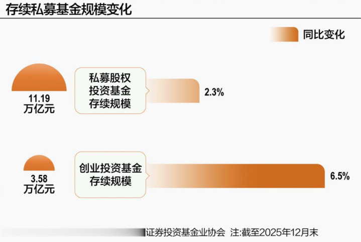 数据显示,截至2025年12月末,存续私募股权、创业投资基金管理人11523家,较一年前有所下降(4.6%);但私募股权投资基金与创业投资基金存续规模分别达到11.19万亿元和3.58万亿元,较上年同期均有所增长(2.3%和6.5%)。